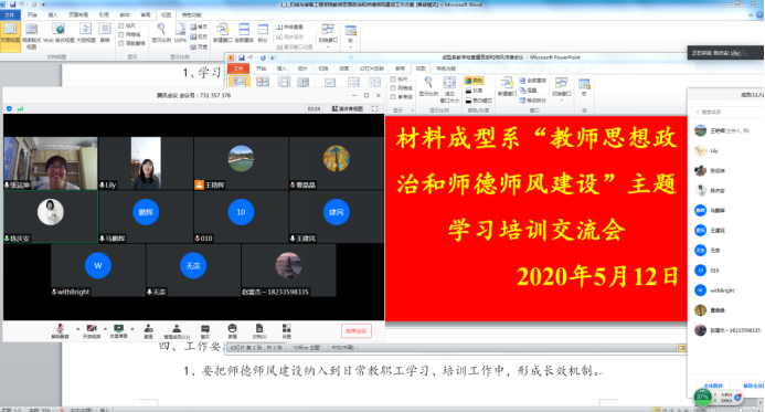 5月12日下午4点,材料成型系利用“腾讯会议”组织召开了“教师思想政治和师德师风建设”主题学习培训交流会,会议由系支部书记王艳辉老师主持,成型系全体教师参会。