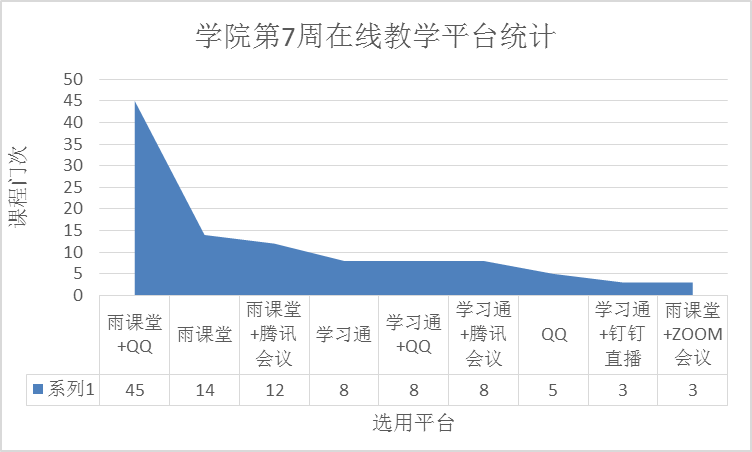 永利官网教师本周使用线上教学选用各平台占比情况,如上图所示,本周任课教师使用平台种类与上周无变化。雨课堂+QQ分屏占45门次,位列第一;排第二位为雨课堂占14门次;雨课堂+腾讯会议12门次,位列第三。